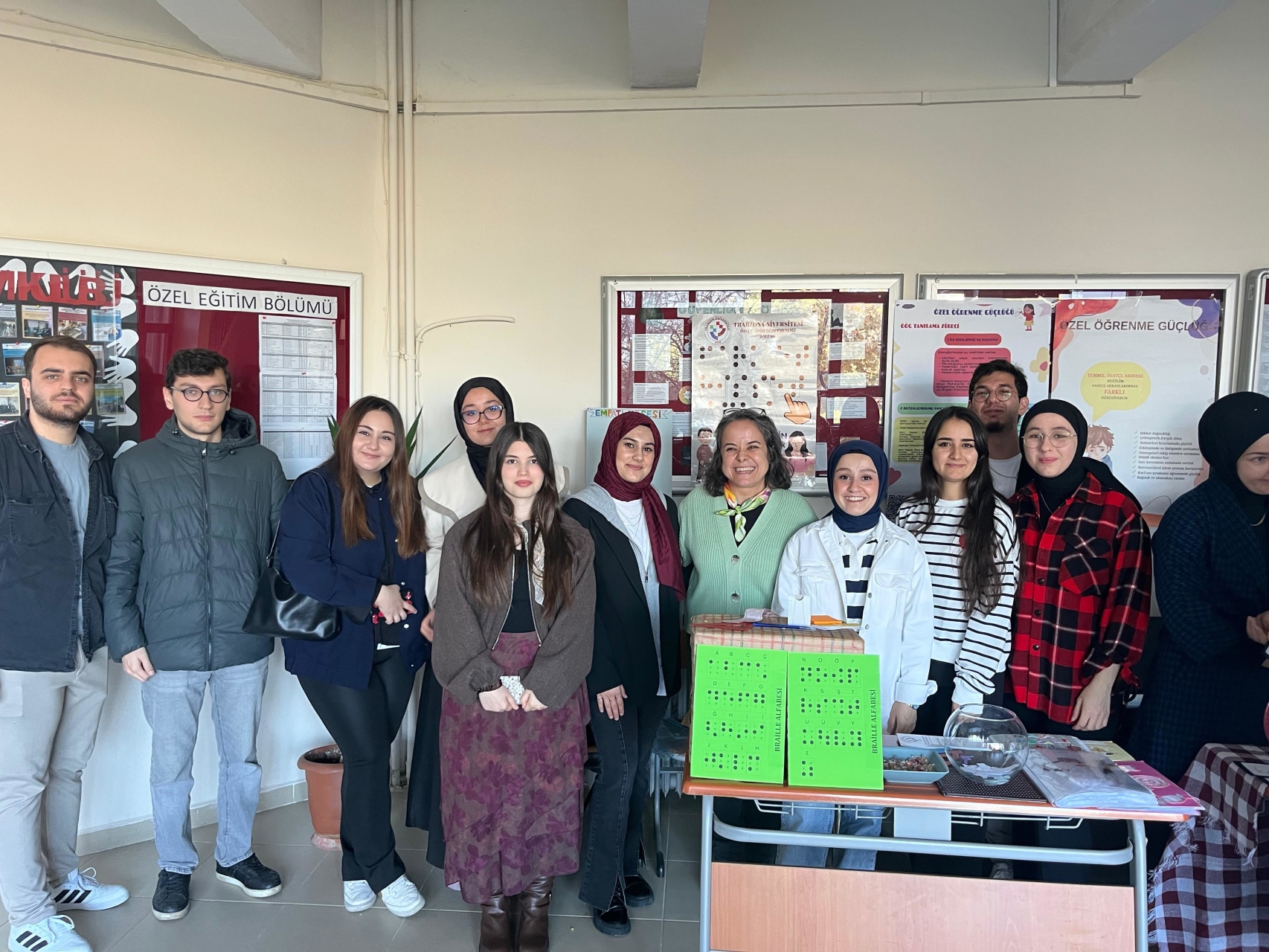 3 Aralık Dünya Engelliler Günü kapsamında, Trabzon Üniversitesi Fatih Eğitim Fakültesi Özel Eğitim Bölümü öğrencileri, Topluma Hizmet Uygulamaları dersi doğrultusunda Fakülte A Blok zemin katta, bölümün bulunduğu alanda kapsamlı bir empati ve farkındalık etkinliği düzenlediler. Etkinlik, yalnızca fakülte öğrencileriyle sınırlı kalmayıp, fakültedeki farklı branşlardan öğretmen adaylarının da yoğun katılımıyla geniş bir etkileşim ortamı oluşturdu.