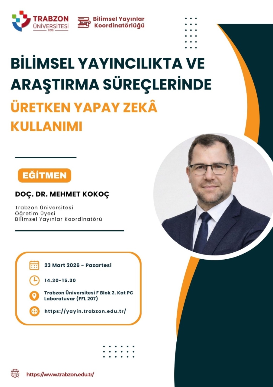 Trabzon Üniversitesi Bilimsel Yayınlar Koordinatörlüğü tarafından düzenlenen “Bilimsel Yayıncılıkta ve Araştırma Süreçlerinde Üretken Yapay Zekâ Kullanımı” başlıklı etkinlik, 23 Mart 2026 tarihinde gerçekleştirildi. Etkinlikte, üretken yapay zekâ araçlarının akademik yazım, araştırma süreçleri ve bilimsel üretimdeki rolü kapsamlı biçimde ele alındı.